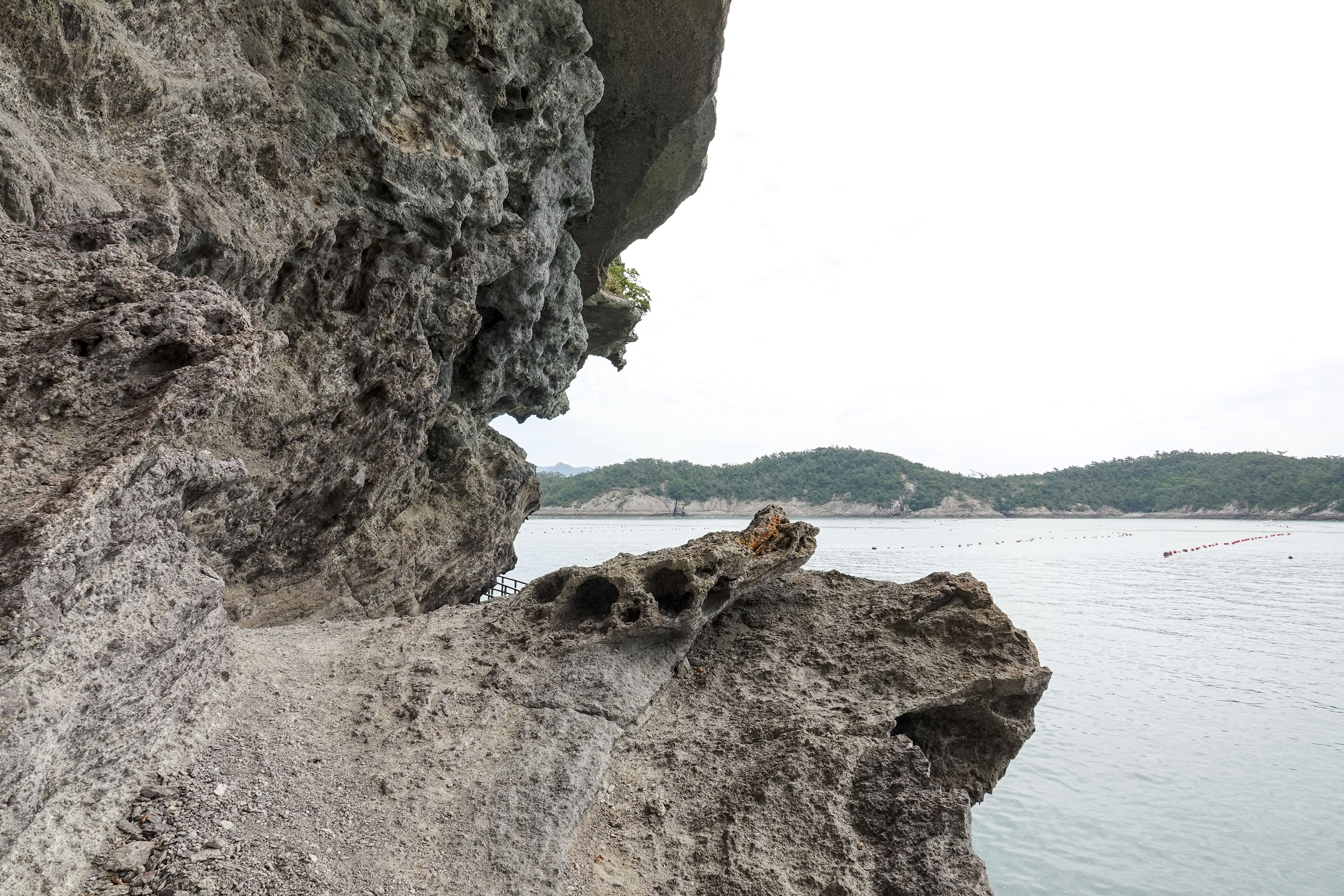 파도와 바닷바람으로 화산암에 기공이 생긴 타포니가 압도적이다.