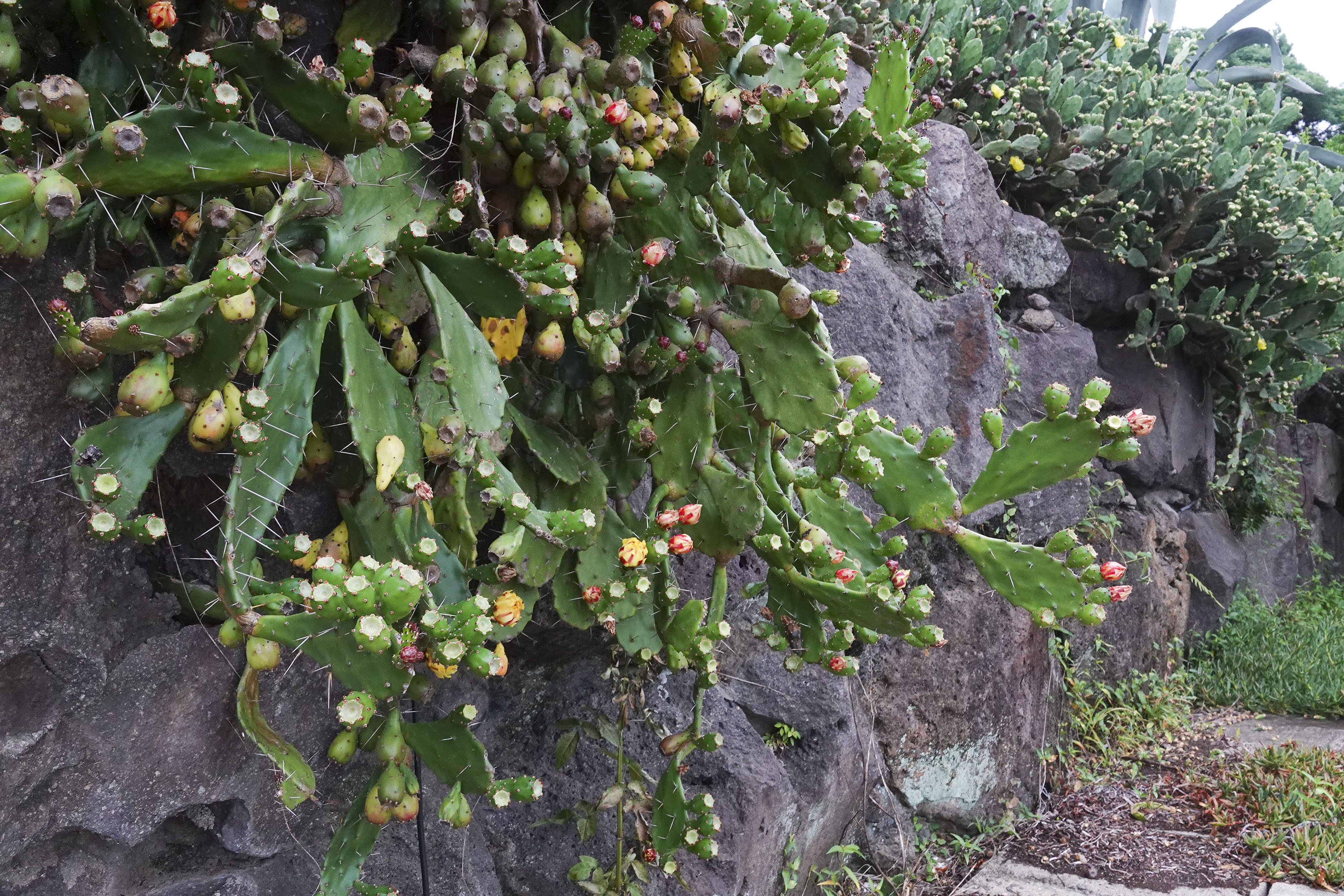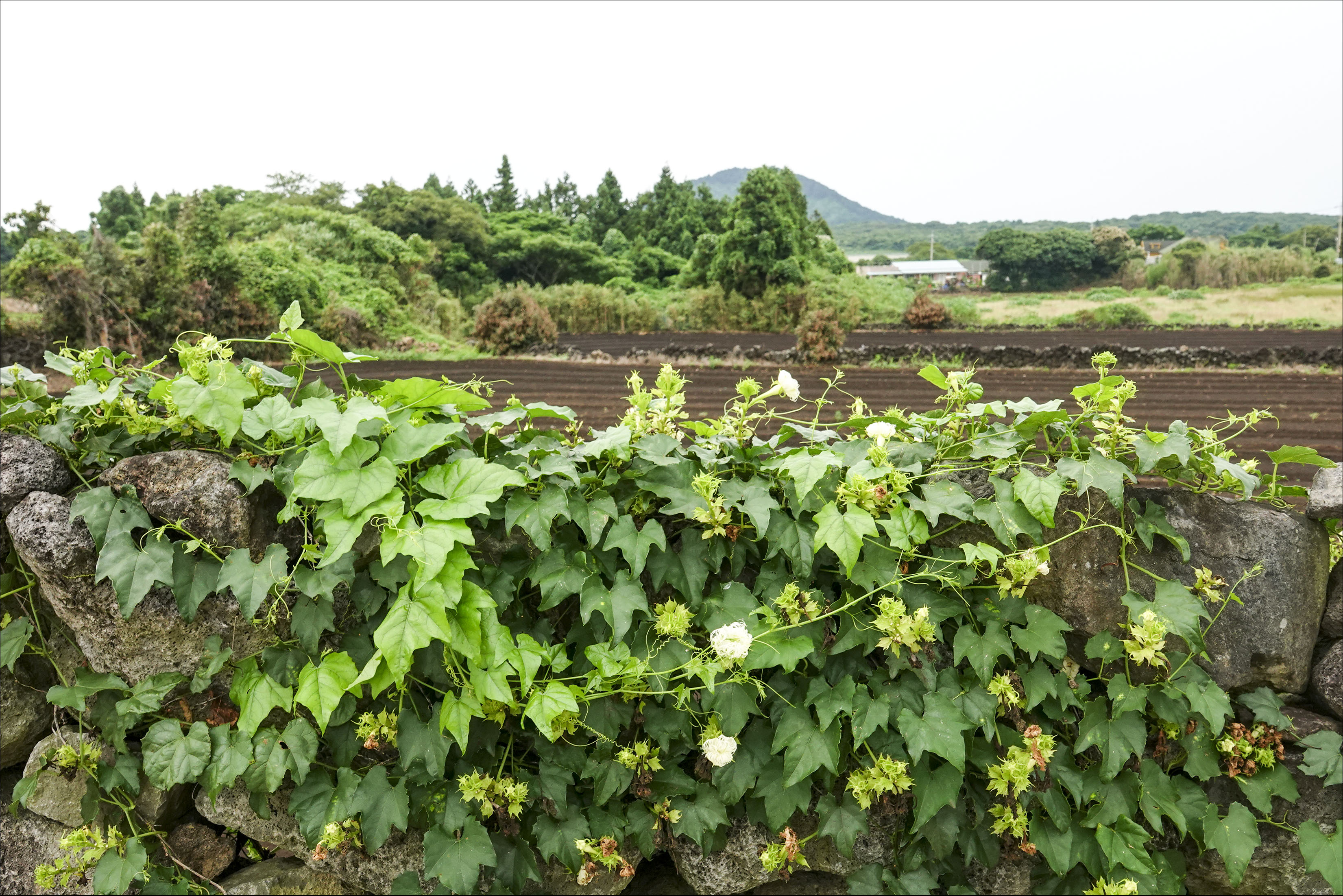돌담 앞에 자랑스럽게 활짝 피어난 하얀 면류관(冕旒冠)
