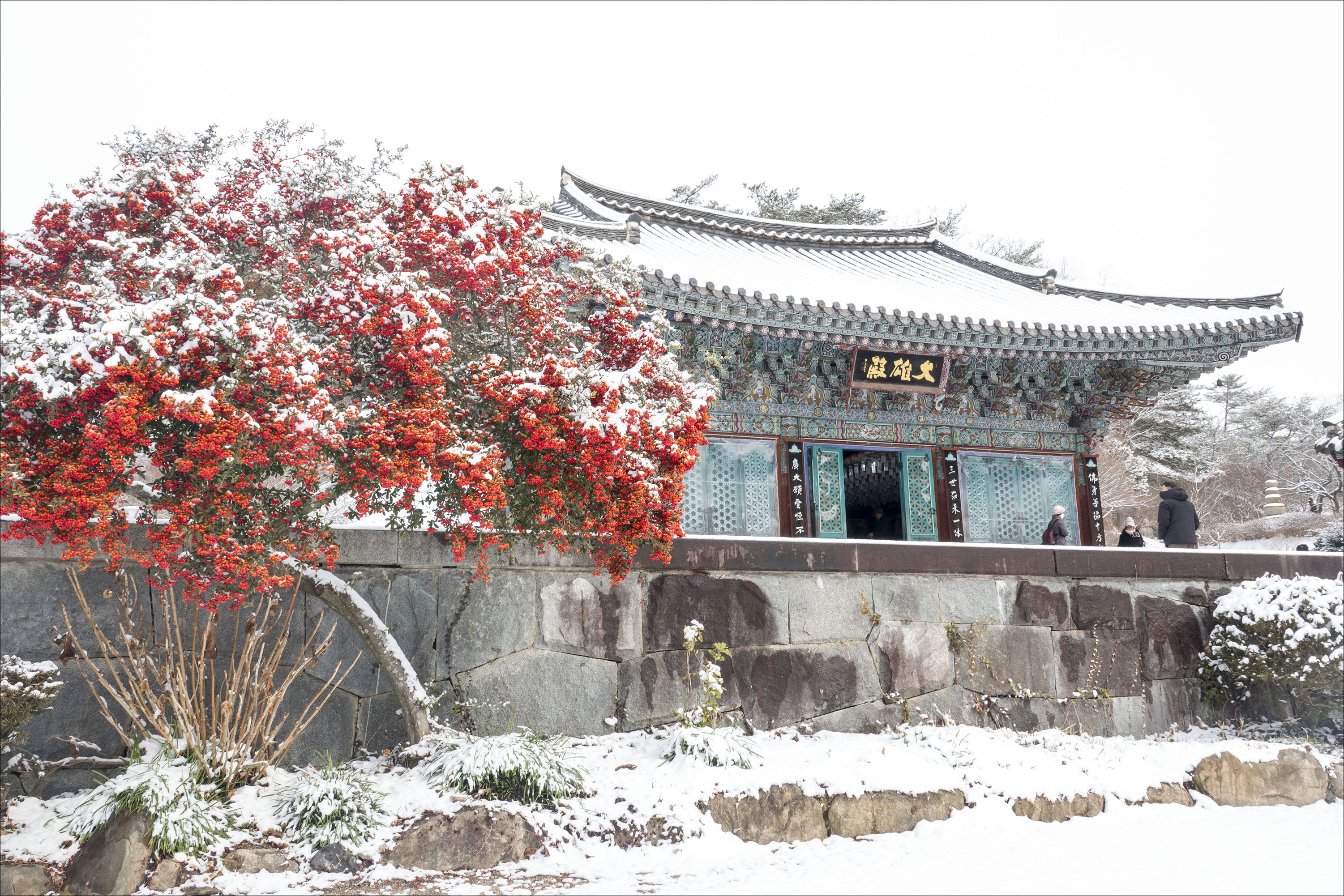 대웅전 앞의 피라칸사스 열매에 홀딱 반했다는.