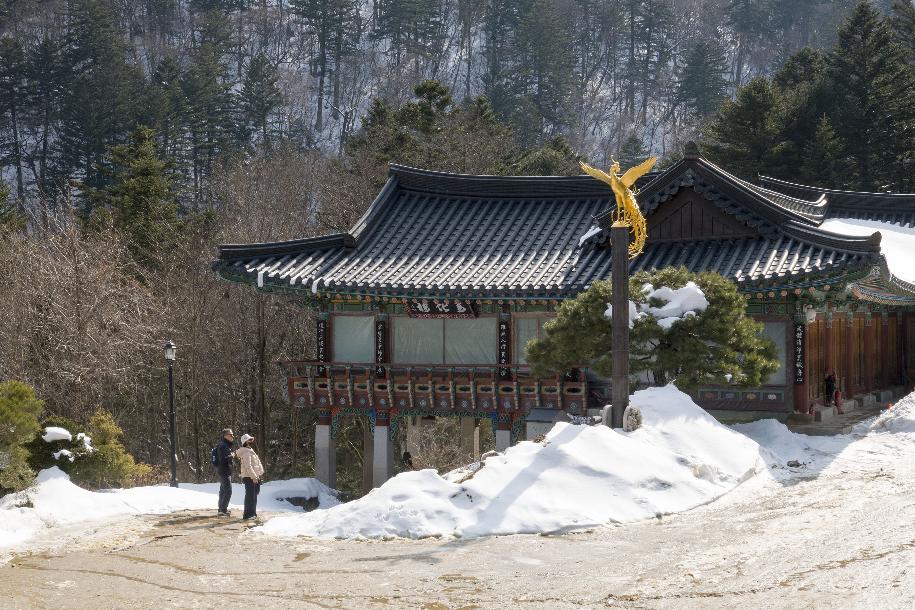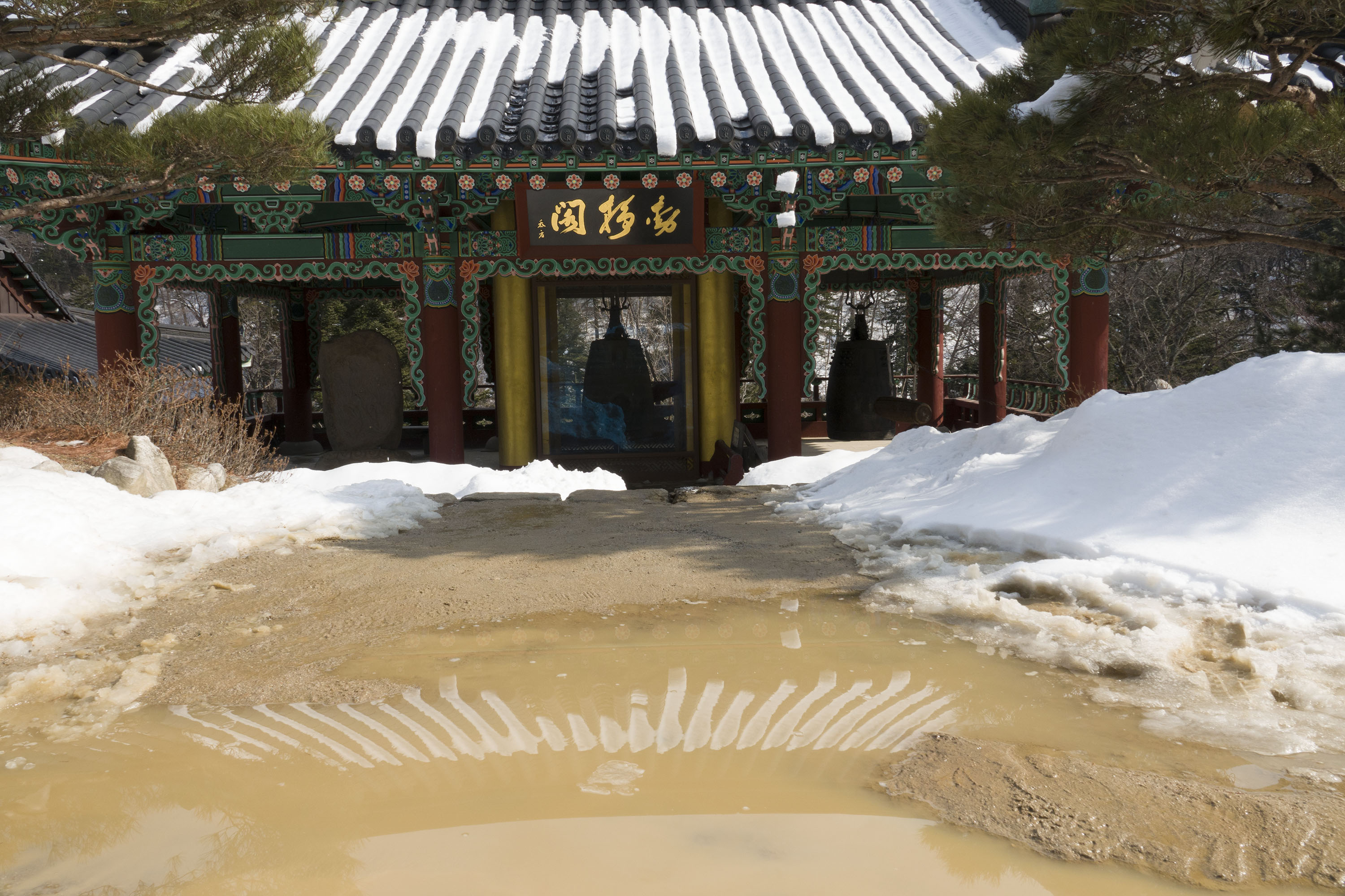 눈 녹은 물 위에 비친 기와지붕, 후두둑 떨어지는 눈덩이.